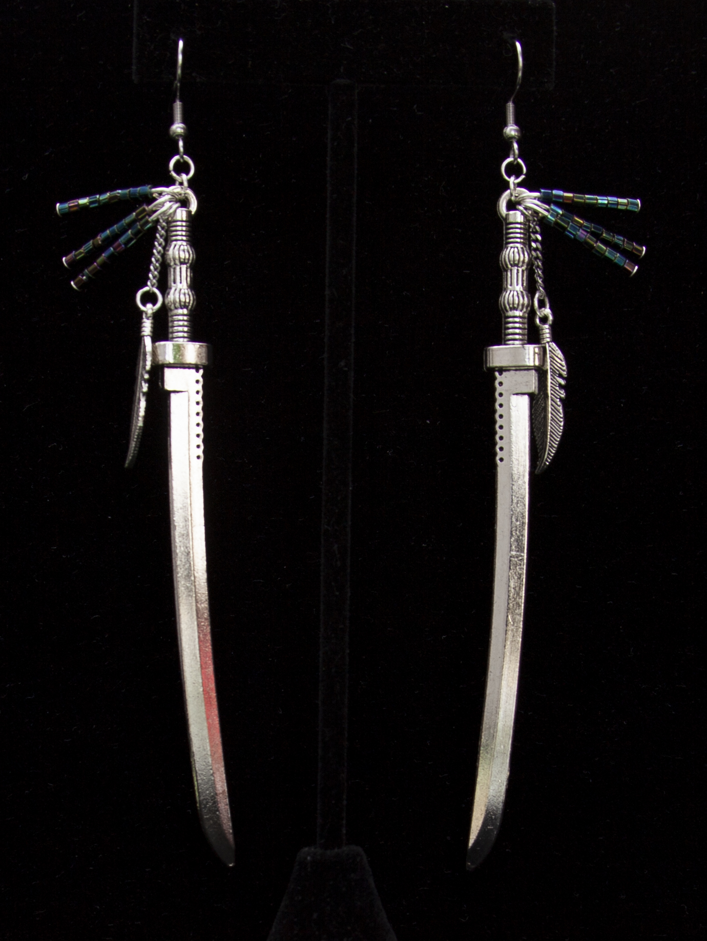 Skip to contentTwo Katana swords decorated with multi colored glass beads and feathers.